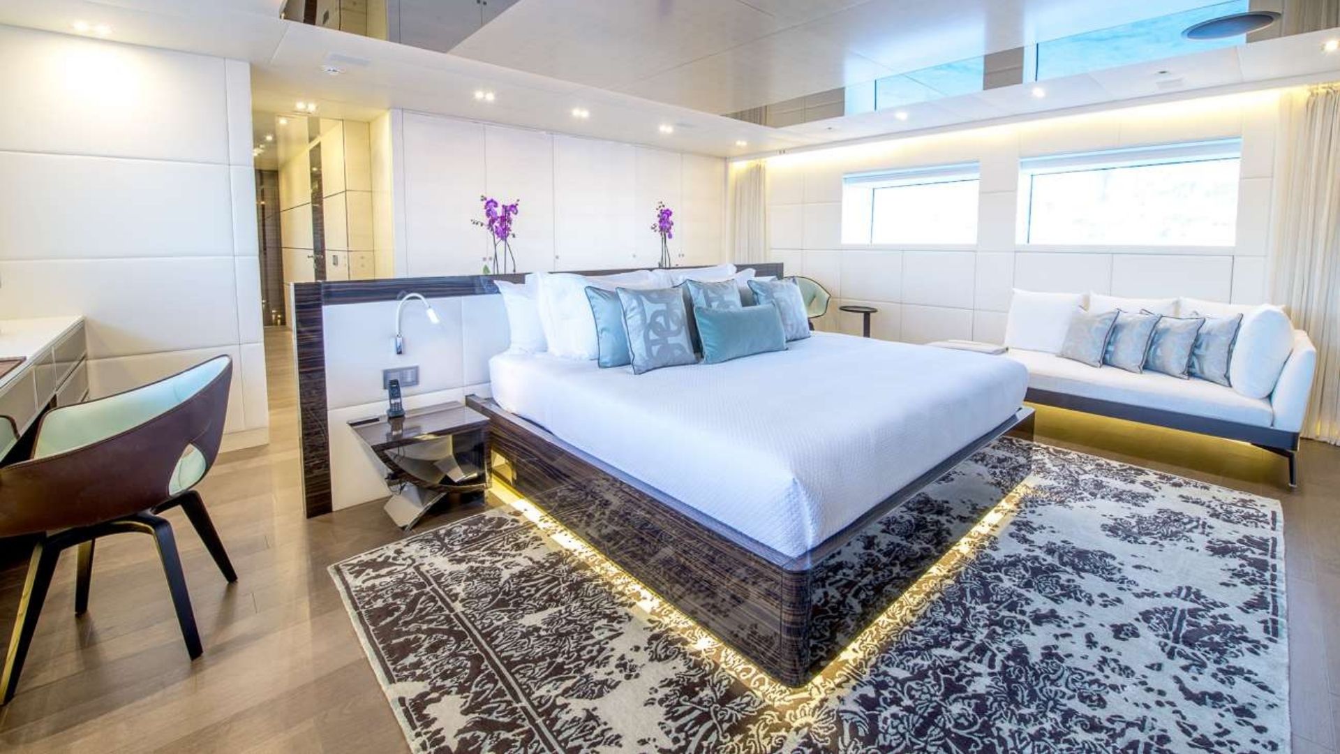 The master suite features a large bathroom with a walk-in closet, private gym, and a professional office space. The other four large guest cabins on the lower deck include two VIP cabins and two twin cabins. The two double VIP rooms convert into triple bed layouts for large families.