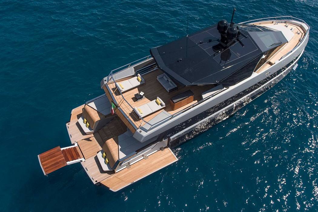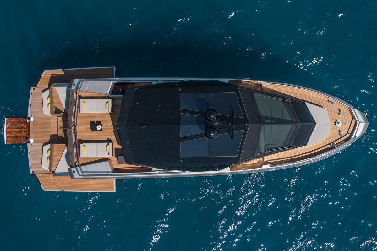 Outdoor areas of Carat include an upper aft deck with sun loungers and a shaded dining table, connected to an enclosed bridge via a large sliding door. Aft lower deck, fold-out wings expand the beach club to 32 square metres, providing sea access on three sides. Two concealed garages house a 3.95-metre Williams tender and additional water toys.