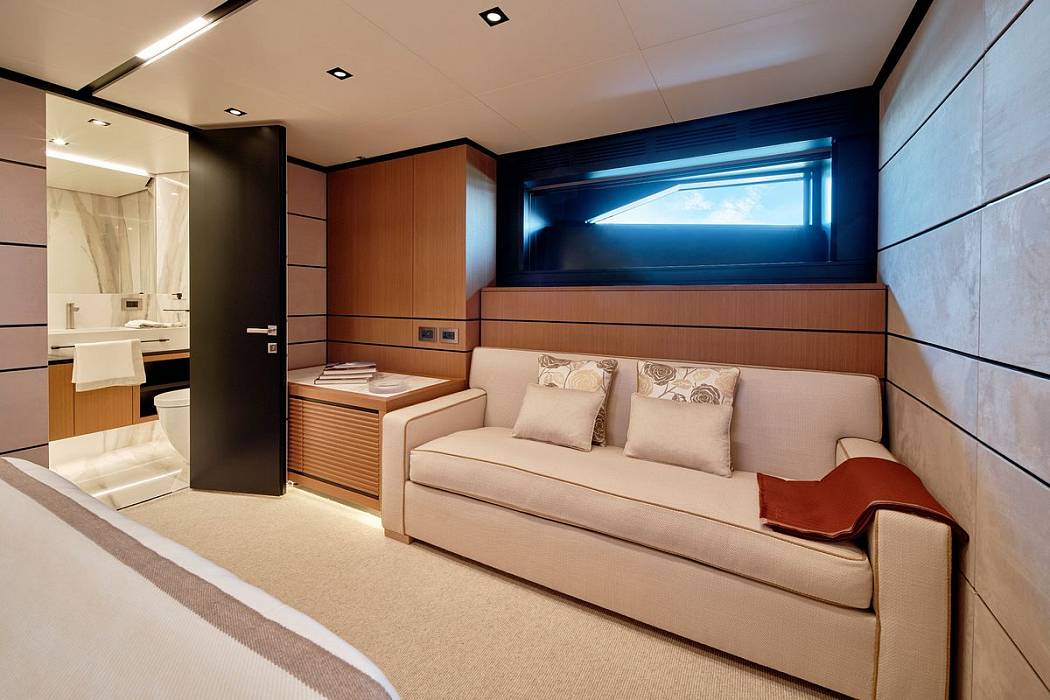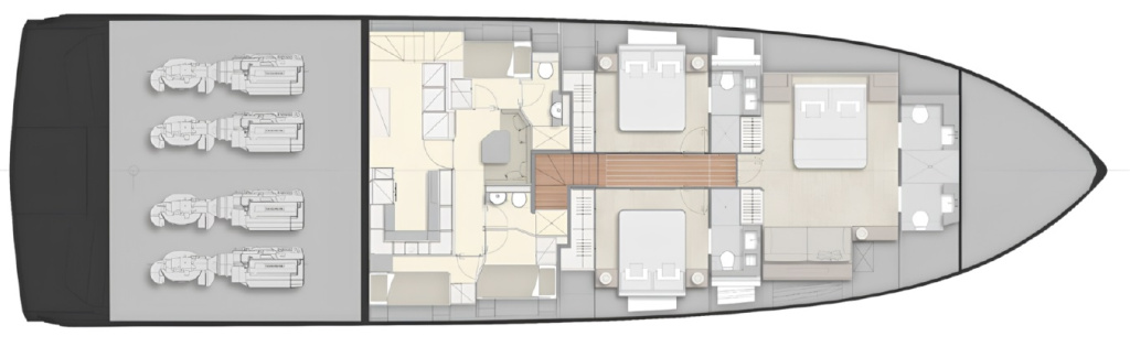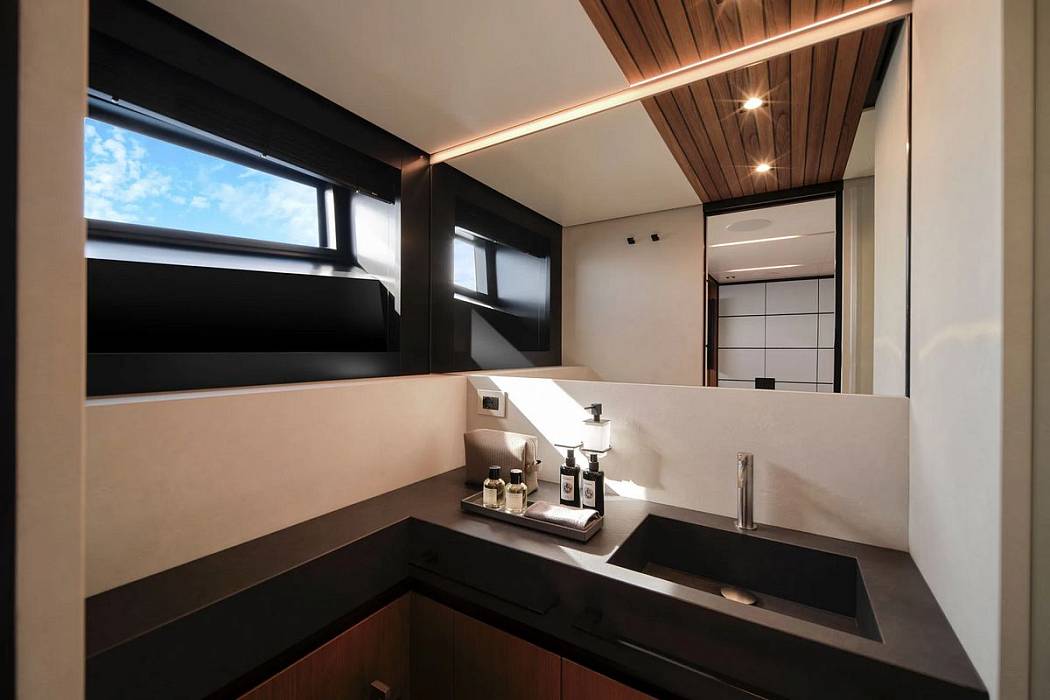 Accommodation on Carat is arranged for owners and guests across four cabins. The forward owner’s suite spans the full beam and includes separate his and hers bathrooms, with 270-degree views through wraparound glass. On the lower deck, there is a VIP suite and two guest cabins, all with en-suite bathrooms.