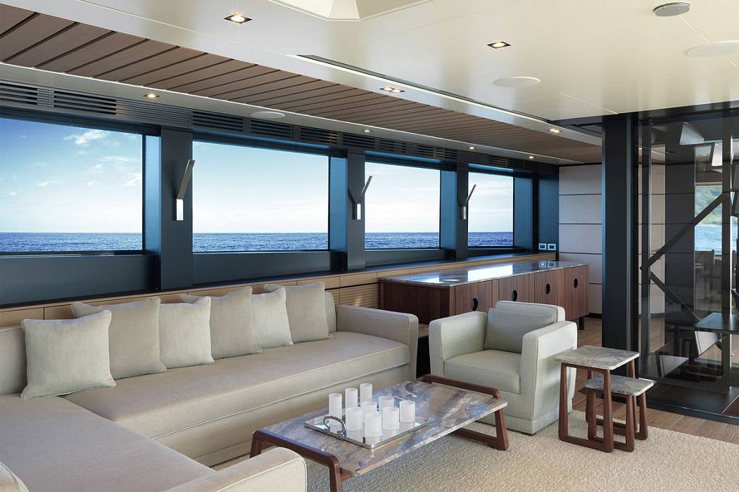 Carat features a 61-square-metre full-beam main salon, around 50% larger than salons in her class. This open-plan area is defined by a central carbon-fiber staircase that structurally links the lower deck accommodation to the upper deck sky lounge. A continuous band of vertical glazing surrounds the main deck, delivering abundant natural light and panoramic views.