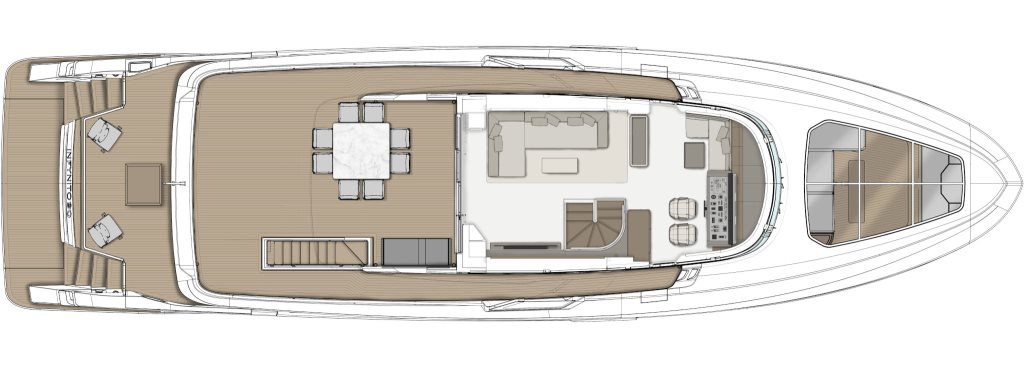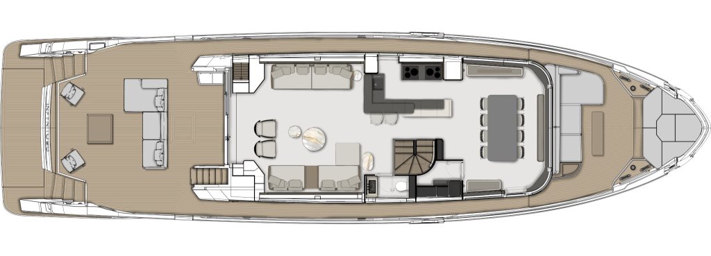 On the upper deck, Ferretti Infynito 90 offers both open-air and enclosed areas: the aft section provides sunbathing space, while the enclosed lounge functions as a secondary salon. This area is equipped with a sofa, a television, and a second helm station.