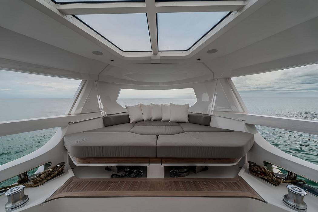 On the upper deck, Ferretti Infynito 90 offers both open-air and enclosed areas: the aft section provides sunbathing space, while the enclosed lounge functions as a secondary salon. This area is equipped with a sofa, a television, and a second helm station.