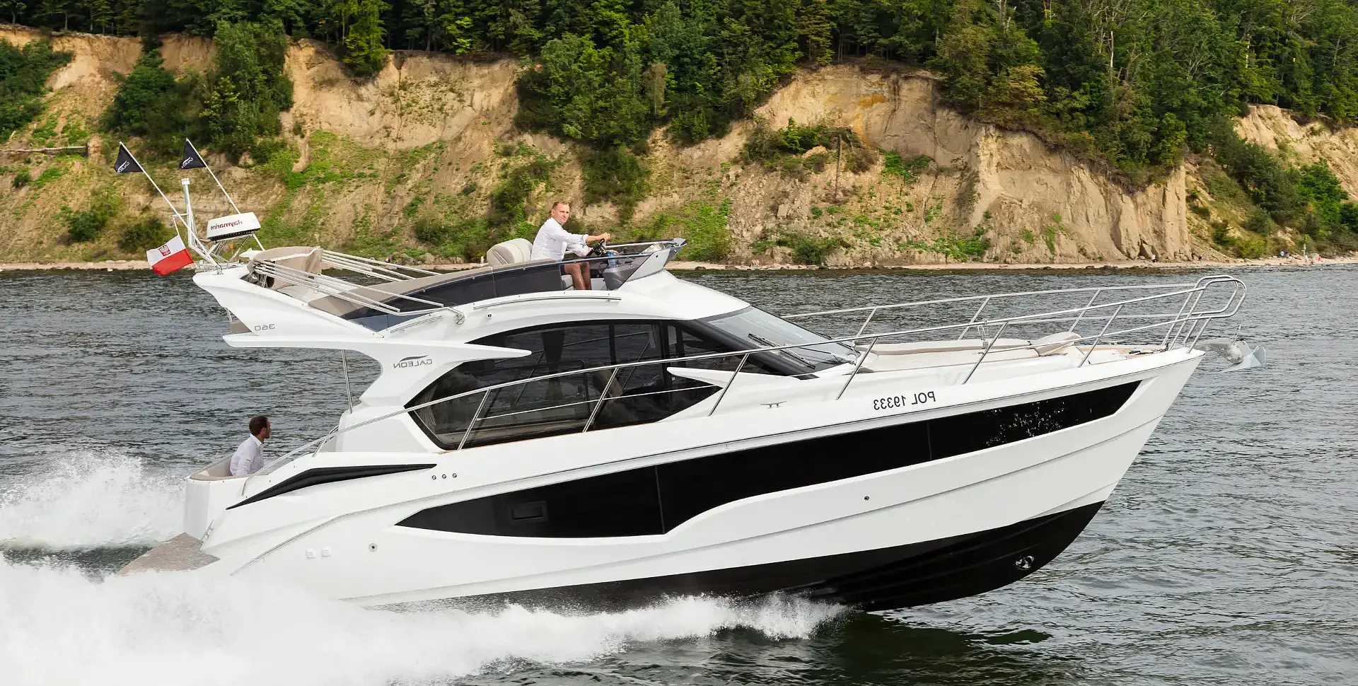 With a clever interior layout, the Galeon 360 FLY yacht offers a surprisingly roomy living arrangement on board with three cabins down below. The striking exterior is a staple of the Galeon design.
