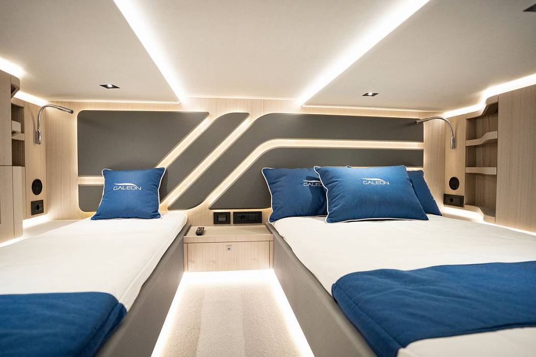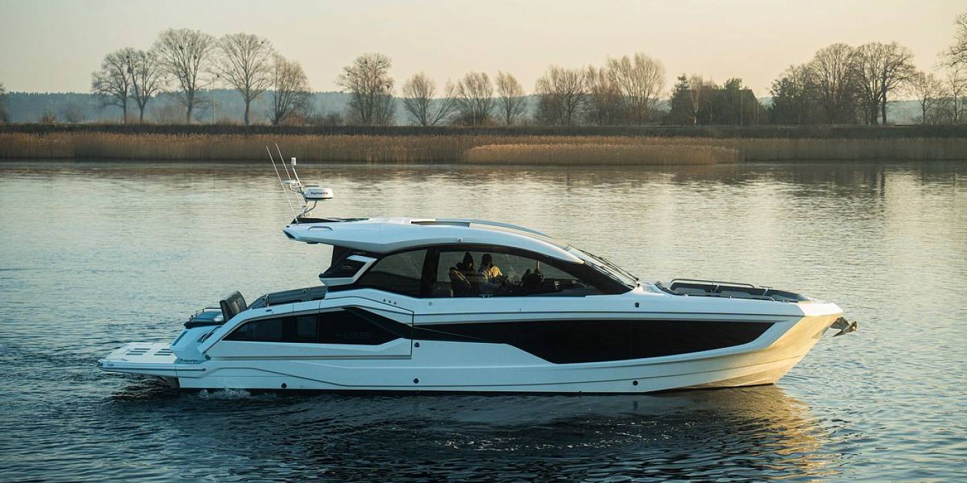 Available for order. Galeon 435 GTI sets a new benchmark for luxury day cruising. She seamlessly combines cutting-edge design, superior performance, and practical versatility, solidifying her position as an exceptional choice for yachting enthusiasts. Powered by twin inboard engines, the 435 GTI offers a sleek profile, efficient handling, and innovative features, ensuring an outstanding experience whether cruising along the coast or hosting guests.Her striking two-tone exterior features expansive full-length windows, partially glazed balconies, and a bold, sporty aesthetic. The glass-enclosed, climate-controlled wheelhouse provides panoramic views while ensuring comfort in any weather.
