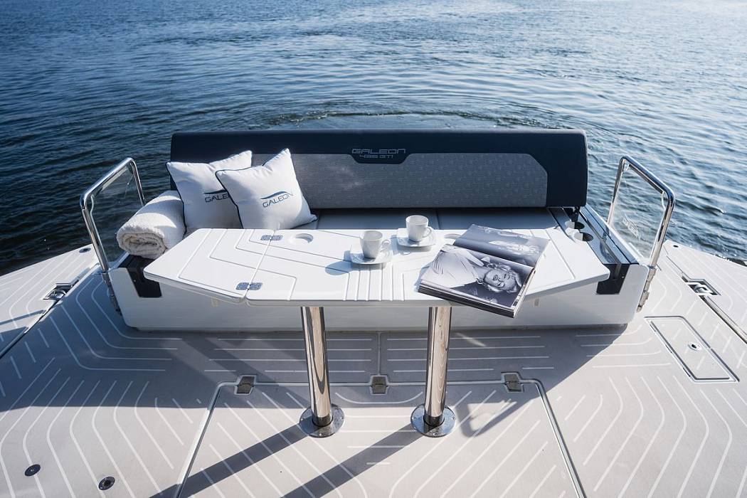The 435 GTI yacht’s cockpit showcases Galeon’s renowned ingenuity. Transformable seating options allow you to create a sunpad or adjust seating orientation to maximize comfort. A concealed garage beneath the seats accommodates water toys, while the hydraulic platform ensures seamless access to the water. The retractable sunshade adds flexibility, offering shade or full sun exposure as desired.