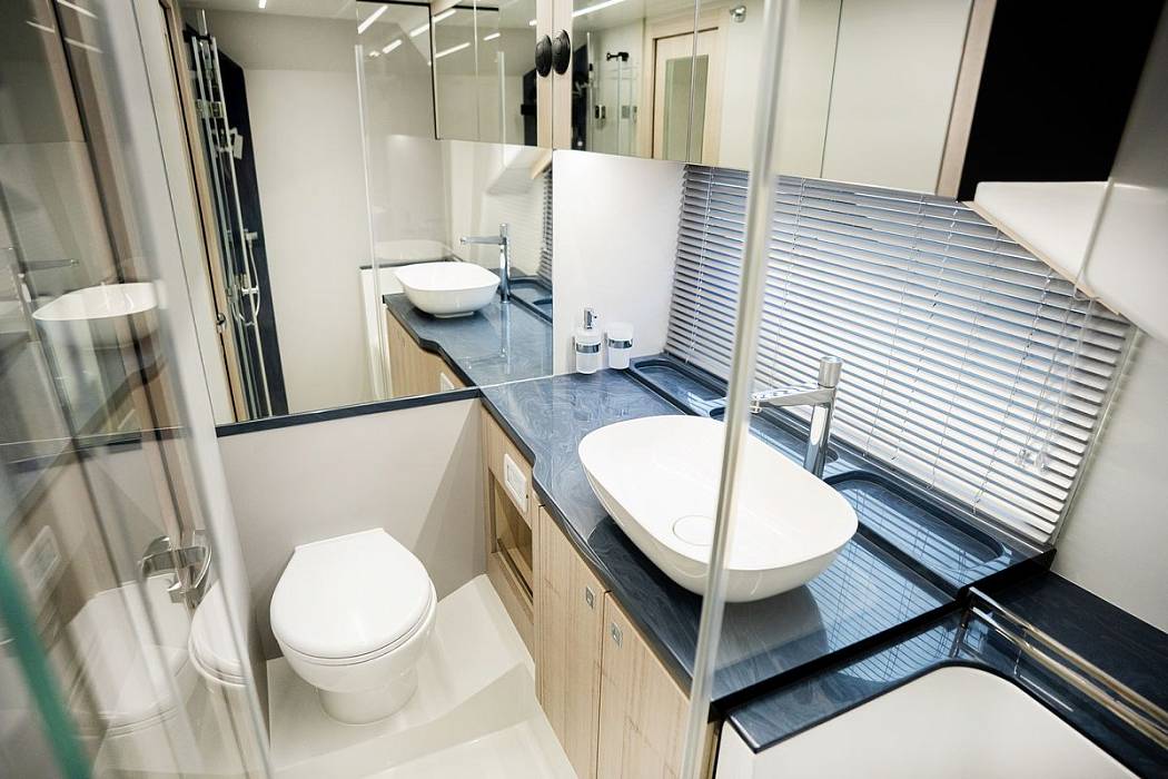 The master suite features a double bed, ample storage, and natural light, while the guest cabin provides flexible sleeping arrangements. The galley and head, complete with a walk-in shower, offer the conveniences of home aboard the 435 GTI yacht.
