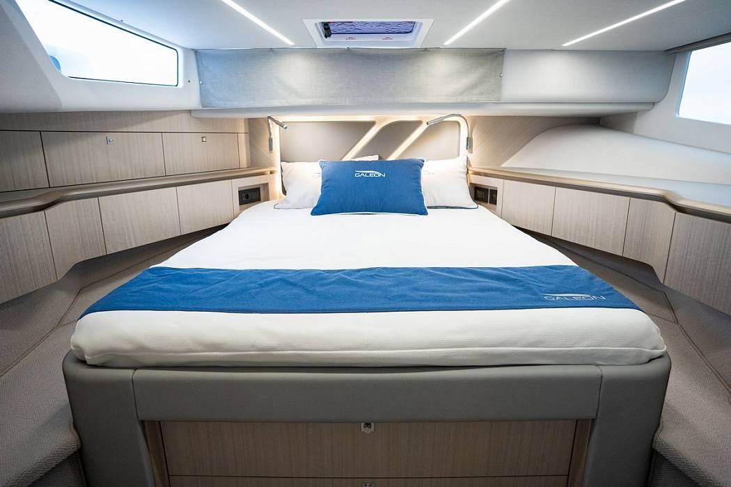 Inside, the Galeon 435 GTI boasts a thoughtfully designed main deck with a sliding glass door that connects the open cockpit to the interior. A wet galley, U-shaped dinette, and ergonomic sport seats opposite the helm enhance the yacht's functionality. Drop-down windows and a retractable sunroof ensure an enjoyable atmosphere regardless of the weather.