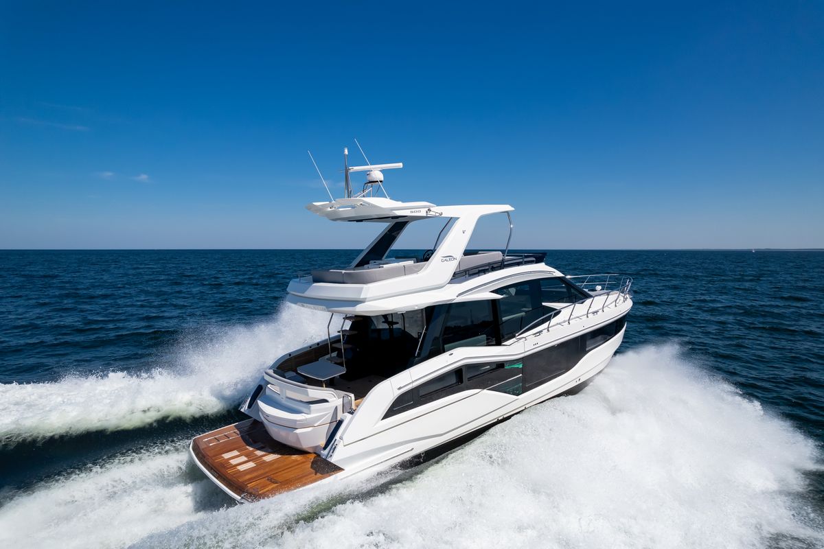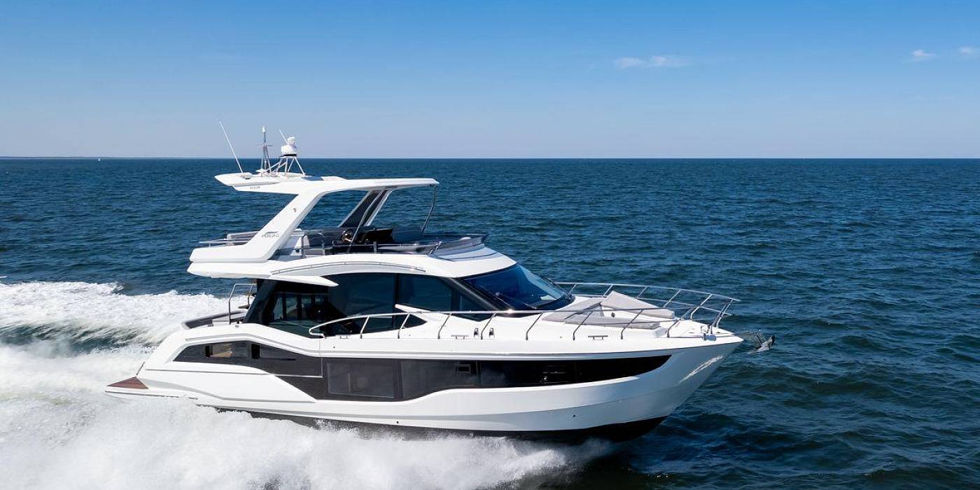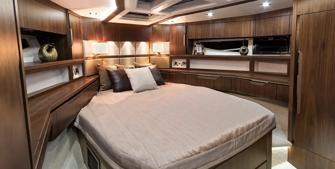 A bright interior of the saloon is fitted with leisure and dining areas as well as a functional helm station with great visibility. The lower deck of the Galeon 500 FLY has three cabins and two bathrooms for a total of six berths. The master one, located midship, holds a double bed, a large wardrobe and a private bathroom. The bow VIP cabin offers spectacular night views thanks to a series of skylights while the third guest cabin can be turned into a study, a wardrobe or an additional leisure area on board Galeon 500 FLY.