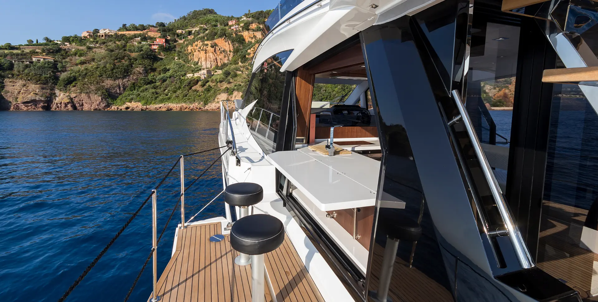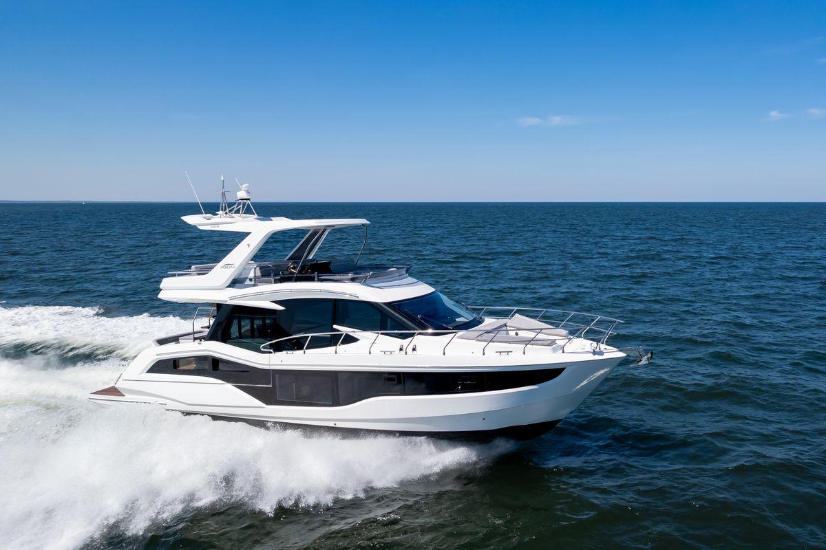 Galeon 500 FLY revolutionized the market by introducing solutions previously seen only on high-end custom designed units. The transformable bow, rotating cockpit area and, most notably, the Beach Mode were the highlights of the Galeon 500 FLY noticed by customers and industry professionals alike.Choose between a full-sized garage with a sun pad on top, a classic L-shaped sofa and crew cabin setup or the innovative roto-seat option that includes a compact garage on board Galeon 500 FLY. All three layouts will let you take full advantage of the unique Beach Mode option that extends the width of the cockpit to a stunning six meters by dropping down both the port and starboard sides.
