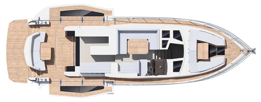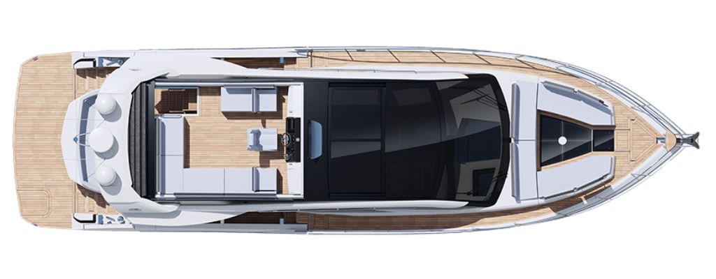 The Galeon 510 SKY model is a natural evolution of the award-winning 500 FLY. Sharing the hull design and all the great features that made the 500 so popular, it manages to improve upon it with its innovative top deck features.The Galeon 510 SKY comes fitted with a spectacular glass sunroof over the helm station as well as a top deck with sundecks and extra steering that can be covered with a soft roof when necessary. Three cockpit layouts are available on board Galeon 510 SKY: a full-sized garage with a sun pad on top, a classic L-shaped sofa and crew cabin setup or the innovative roto-seat option that includes a compact garage.