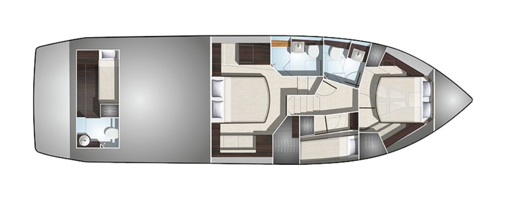 A bright interior of the Galeon 510 SKY yacht's saloon is fitted with leisure and dining areas as well as a functional helm station with great visibility. The lower deck of the Galeon 510 SKY has find three cabins and two bathrooms for a total of six berths. The master one, located midship, holds a double bed, a large wardrobe and a private bathroom. The bow VIP cabin offers spectacular night views thanks to a series of skylights while the third guest cabin can be turned into a study, a wardrobe or an additional leisure area.