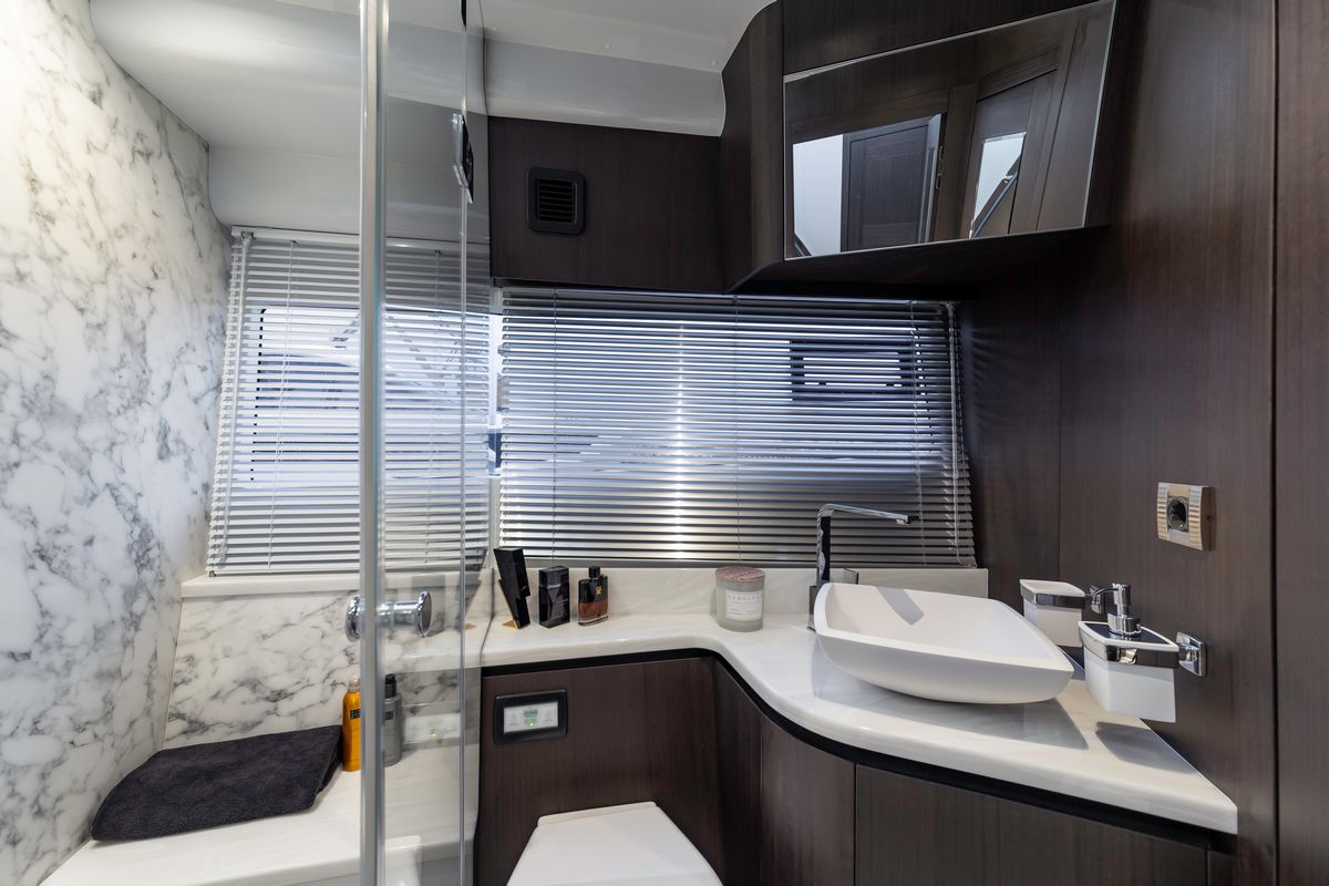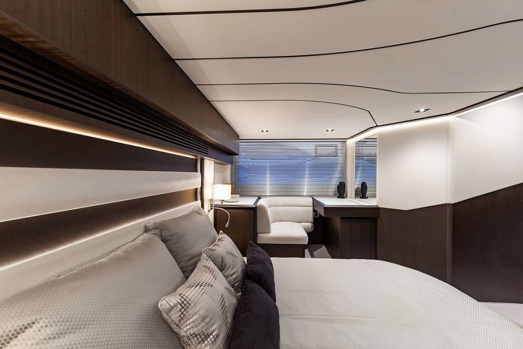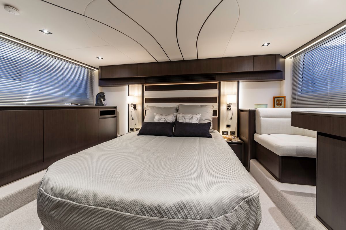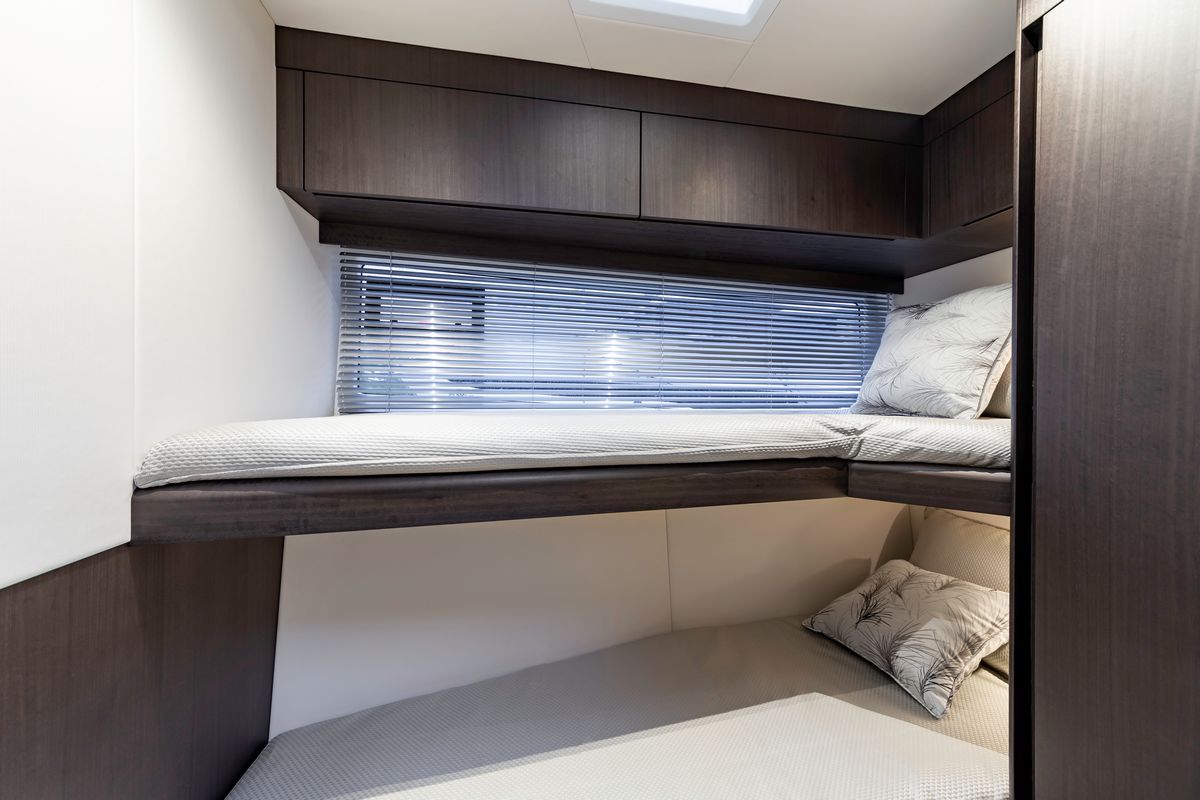 A bright interior of the Galeon 510 SKY yacht's saloon is fitted with leisure and dining areas as well as a functional helm station with great visibility. The lower deck of the Galeon 510 SKY has find three cabins and two bathrooms for a total of six berths. The master one, located midship, holds a double bed, a large wardrobe and a private bathroom. The bow VIP cabin offers spectacular night views thanks to a series of skylights while the third guest cabin can be turned into a study, a wardrobe or an additional leisure area.