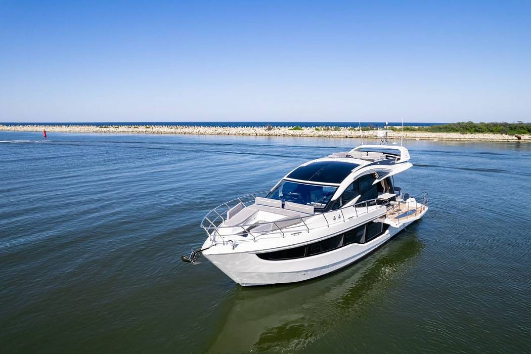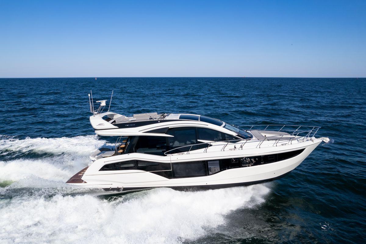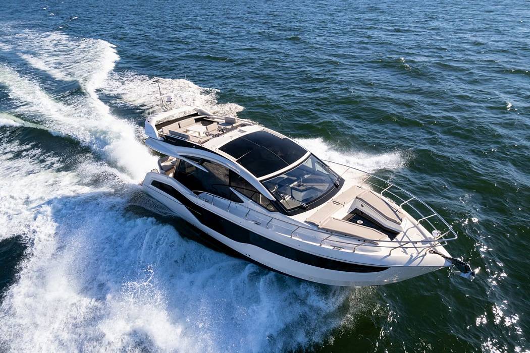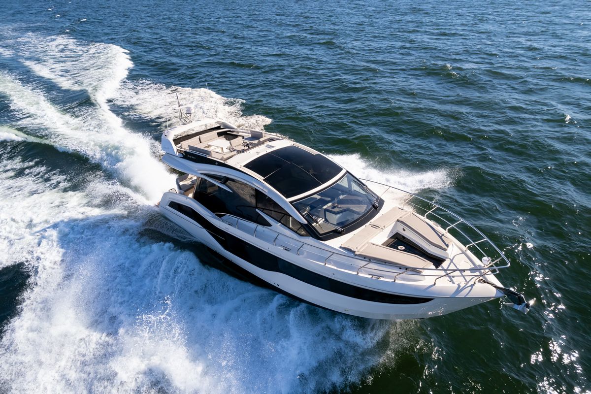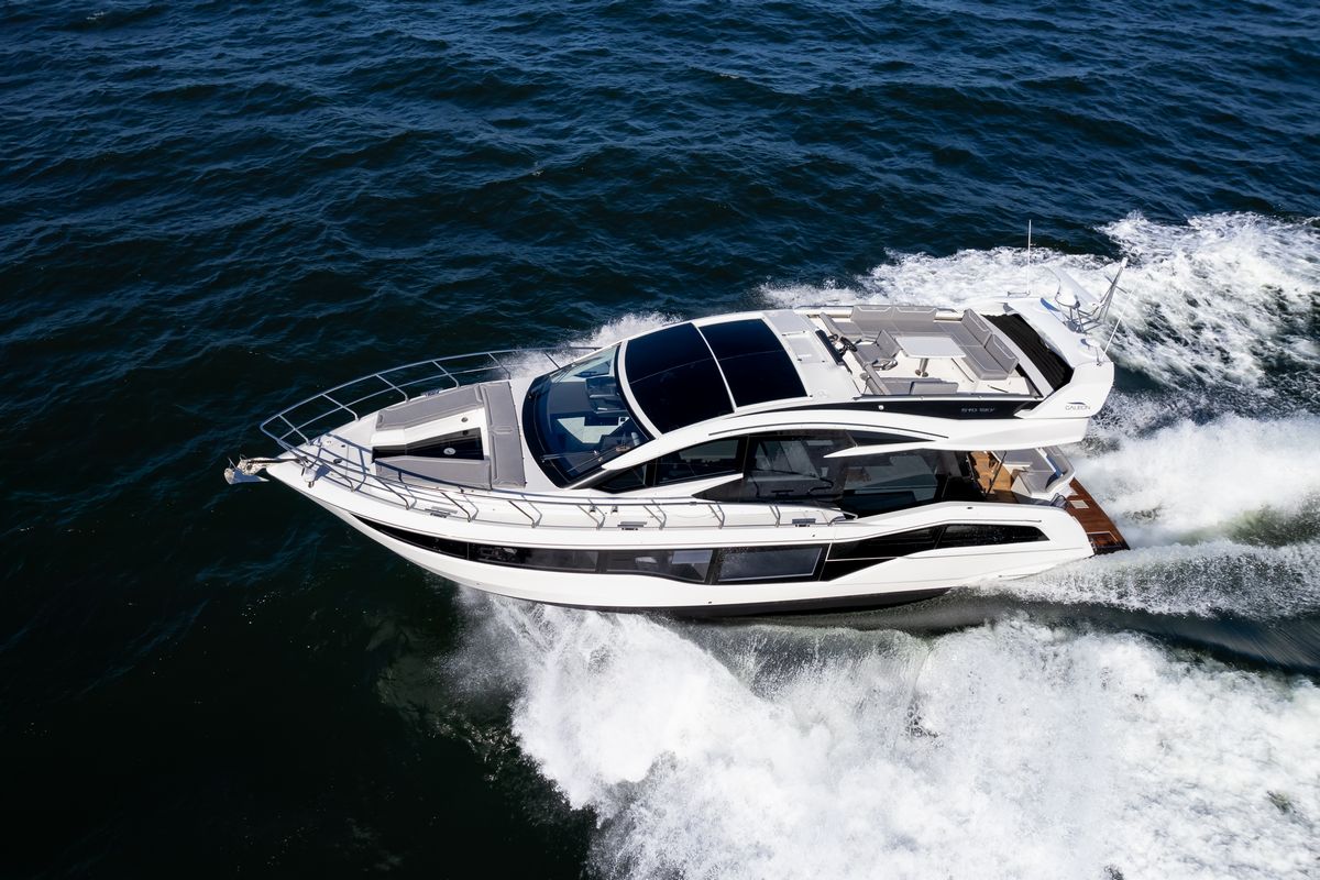 The Galeon 510 SKY model is a natural evolution of the award-winning 500 FLY. Sharing the hull design and all the great features that made the 500 so popular, it manages to improve upon it with its innovative top deck features.The Galeon 510 SKY comes fitted with a spectacular glass sunroof over the helm station as well as a top deck with sundecks and extra steering that can be covered with a soft roof when necessary. Three cockpit layouts are available on board Galeon 510 SKY: a full-sized garage with a sun pad on top, a classic L-shaped sofa and crew cabin setup or the innovative roto-seat option that includes a compact garage.