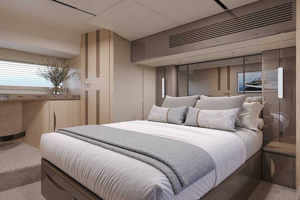 Below deck, the Galeon 520 FLY accommodates up to six guests across three cabins. The full-beam master suite has a private entrance and ensuite, complemented by a forward VIP cabin and a versatile third guest cabin with a sliding bed system that converts between double and twin. An optional skipper’s cabin adds flexibility for longer cruising.