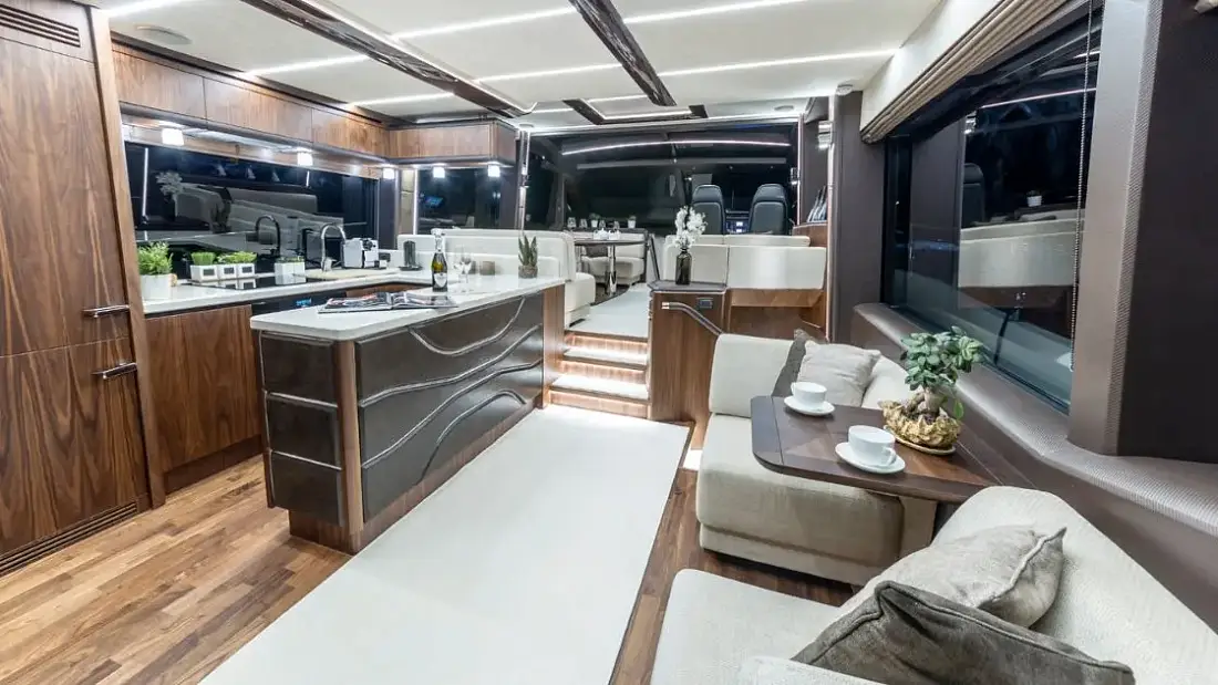 The class’s largest flybridge of the Galeon 680 FLY offers a “Smart Layout” with a bar and recreation space for a dozen or so guests. The bow area is offered in two different layouts: with an assortment of multifunctional power sofas and tables or a classic sundeck with a large sofa.