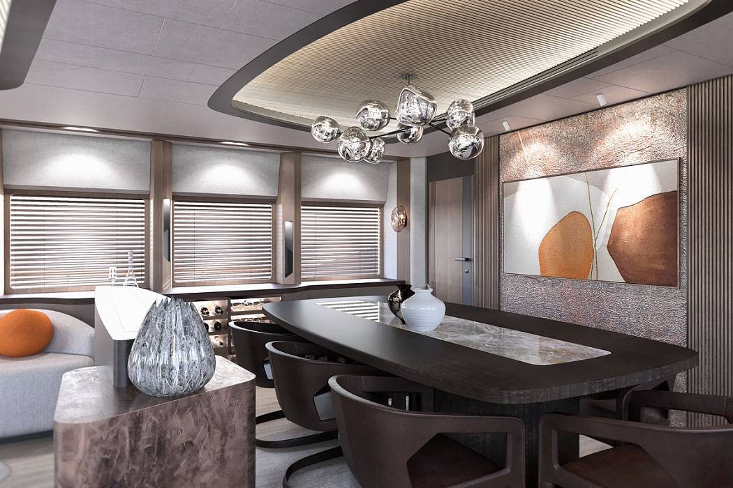 The main salon of the Kando 110 offers a comfortable lounge and dining area connected to the aft deck, where built-in seating and a large table provide an inviting space for outdoor dining. A day head is located forward to starboard, and the enclosed galley to port ensures practical service and crew circulation.