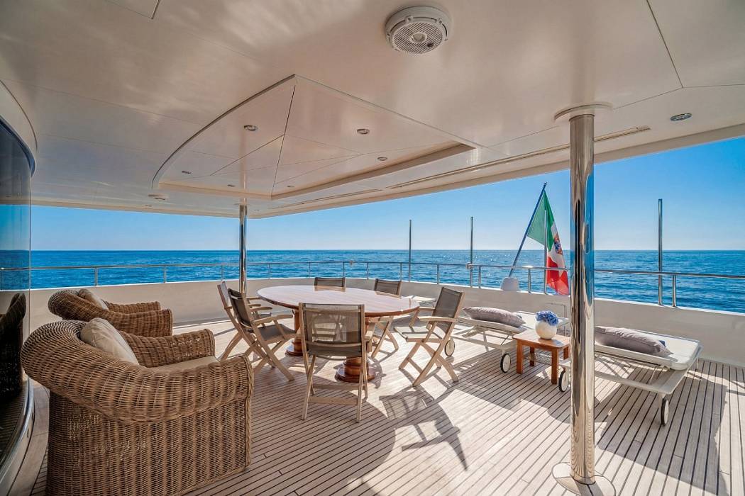 Her exterior lines were drawn by Vincenzo Ruggiero, with outdoor areas arranged across three decks. These include multiple sunbathing sections, a Jacuzzi on the sundeck, generous seating zones and a panoramic sky lounge. The layout supports both private cruising and larger gatherings without compromising circulation between spaces.