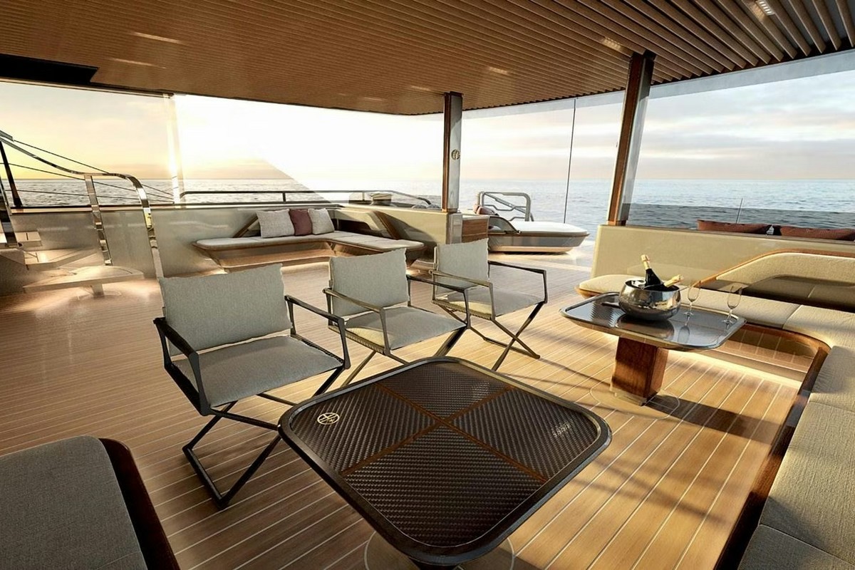The flybridge features dual helm stations for full command, while aft, the cockpit flows into the saloon through expansive sliding glass, uniting indoor sophistication with outdoor freedom. Accommodation includes four double guest cabins and a convertible owner’s studio, all finished with understated luxury and nautical references. Forward crew quarters prioritise comfort and discretion. Even the tender fully recessed in the bow with its own crane - is seamlessly integrated into the yacht’s clean lines.