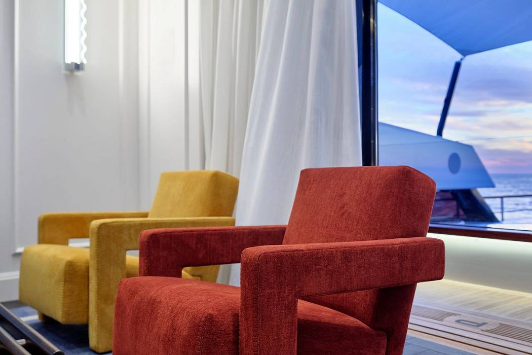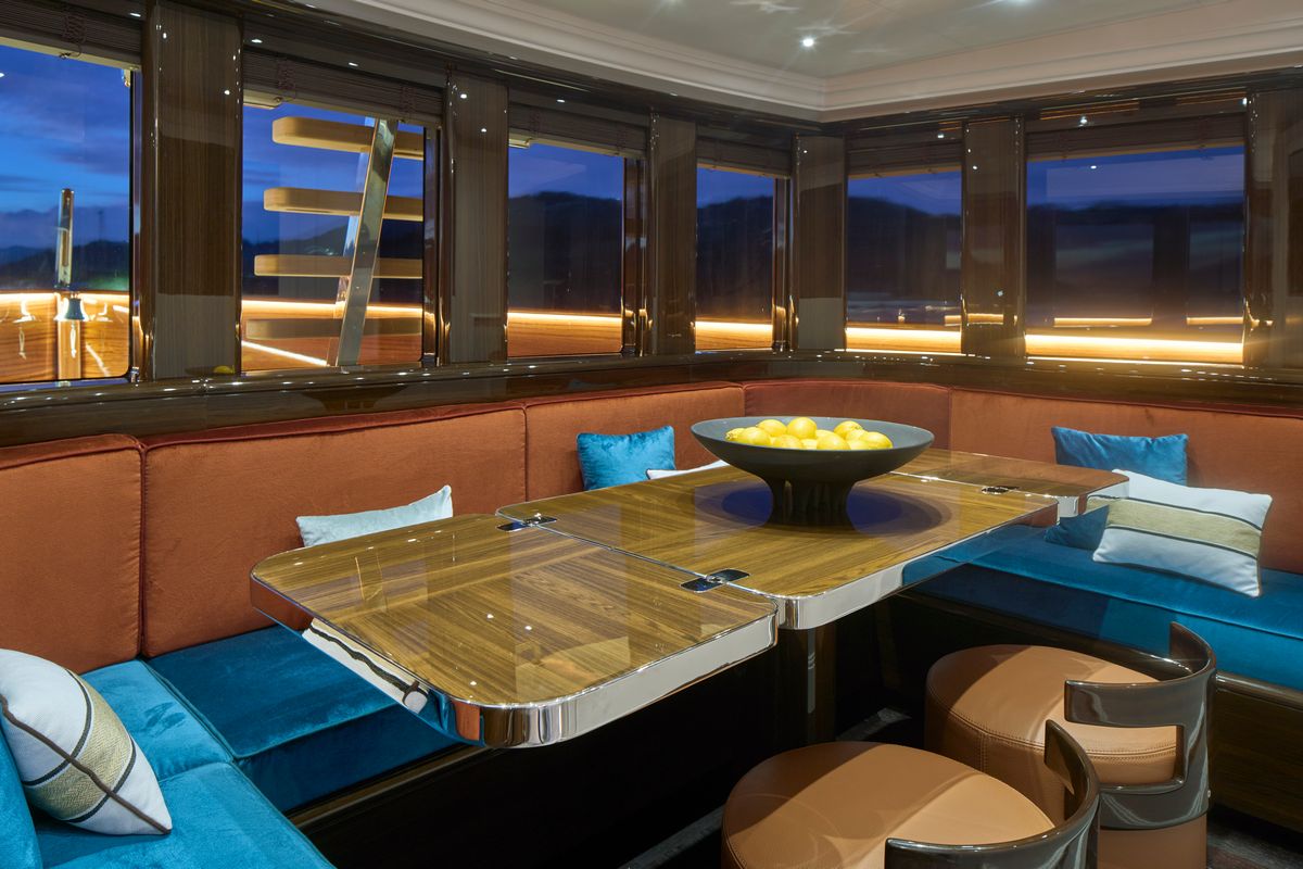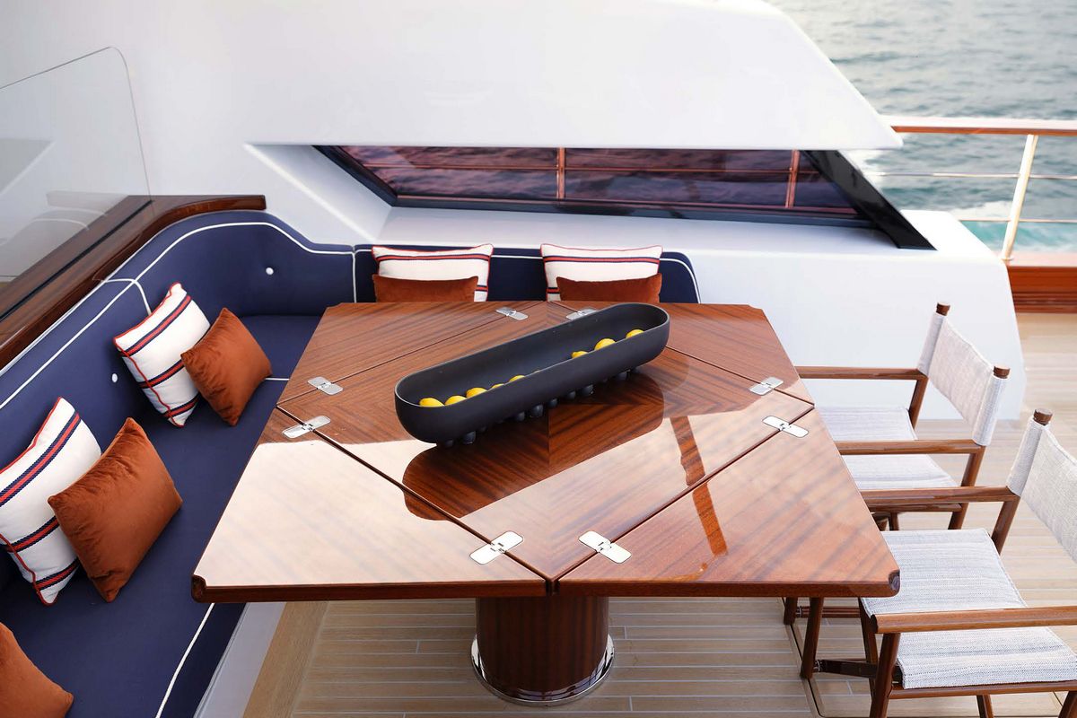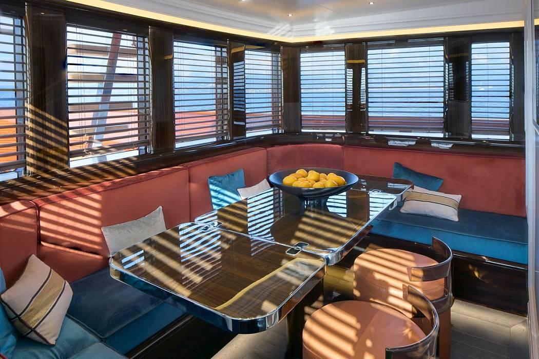 The Picchiotti 24 accommodates up to 6 guests in 3 cabins, with separate crew quarters, plus 2 guests can be comfortably accommodated in a convertible beach club. The interior showcases a timeless design, featuring furniture in rich, deep hues.