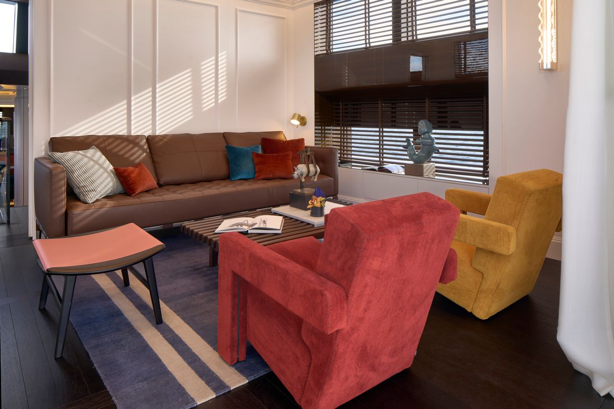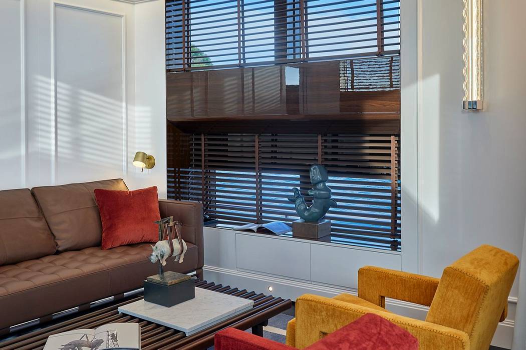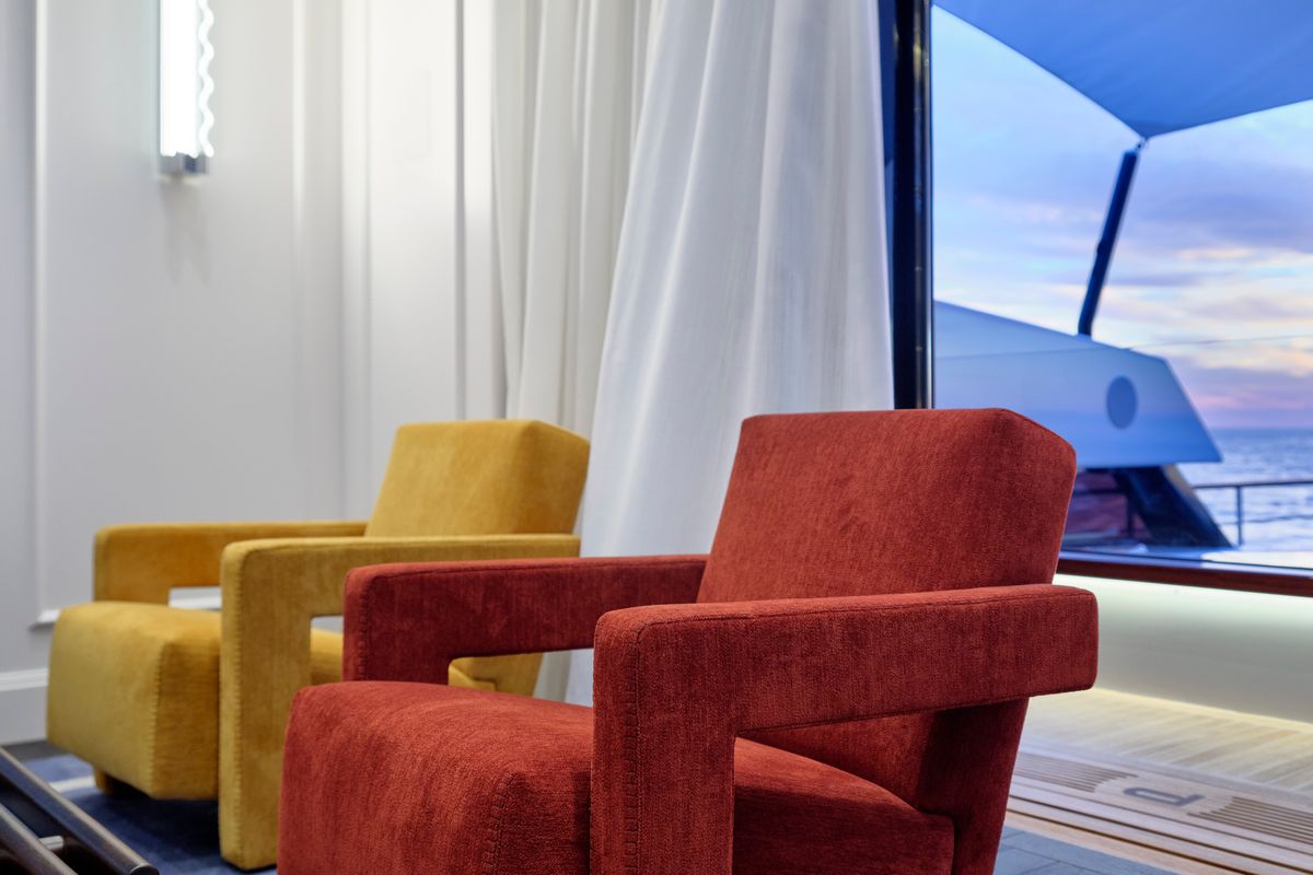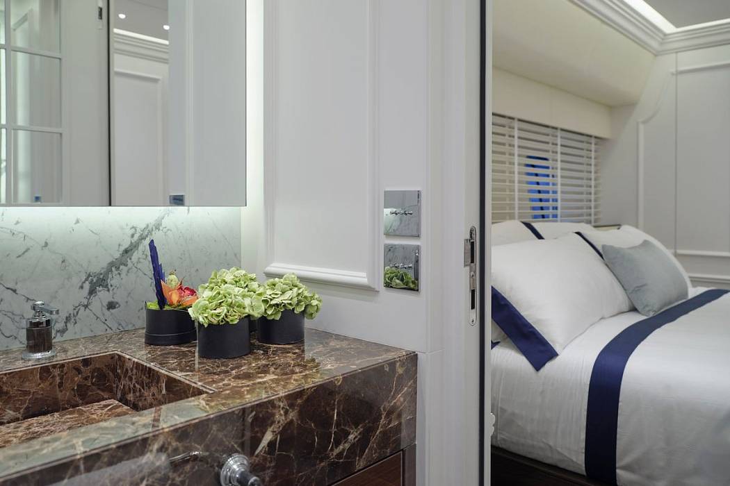 The Picchiotti 24 accommodates up to 6 guests in 3 cabins, with separate crew quarters, plus 2 guests can be comfortably accommodated in a convertible beach club. The interior showcases a timeless design, featuring furniture in rich, deep hues.