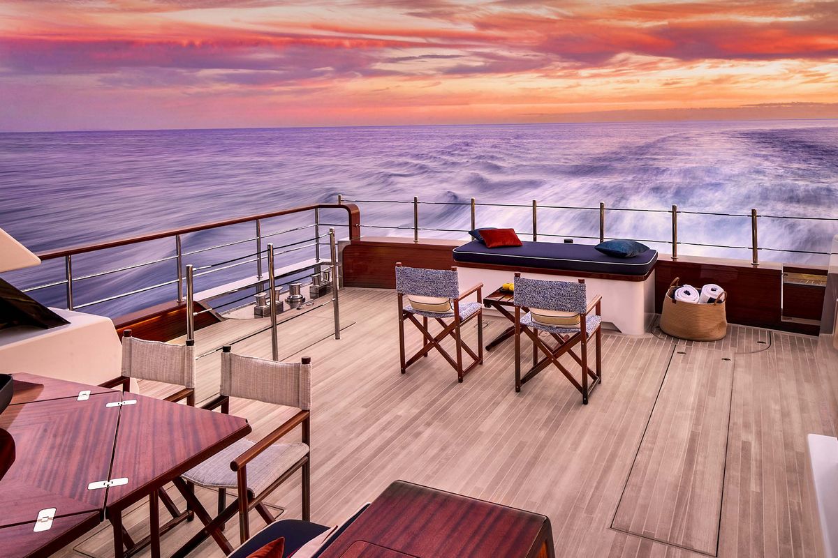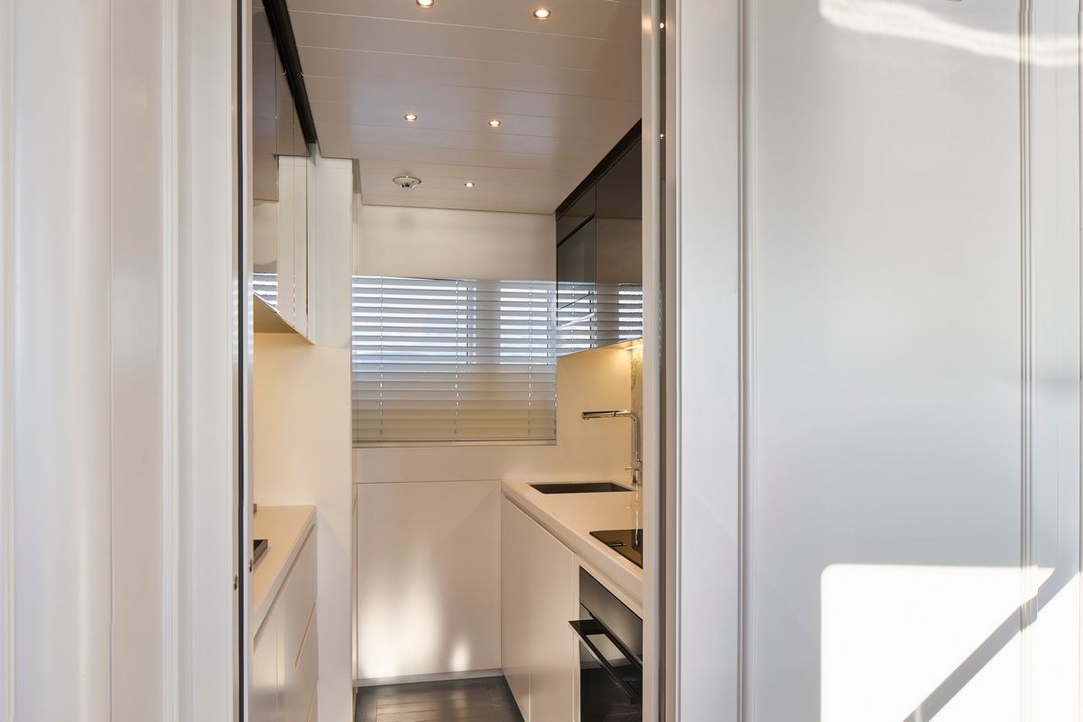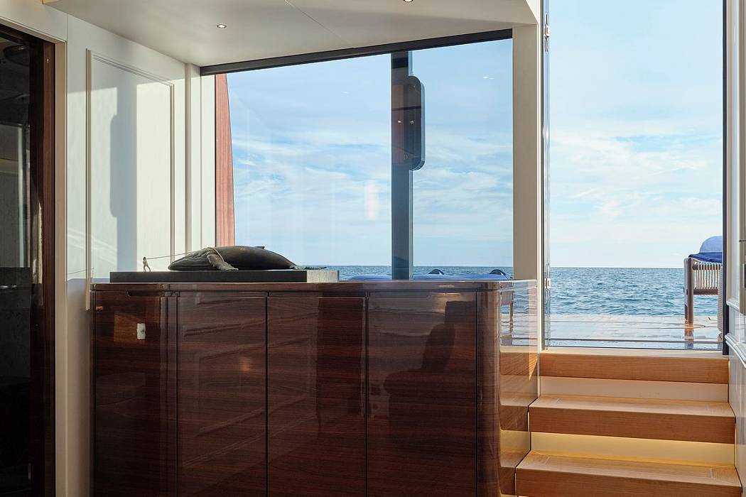 The Picchiotti 24 features a fold-out sea terrace and an enlarged beach club, among the largest in the 24-metre segment. A sliding glass door connects this area directly to the swim platform for single-level water access.