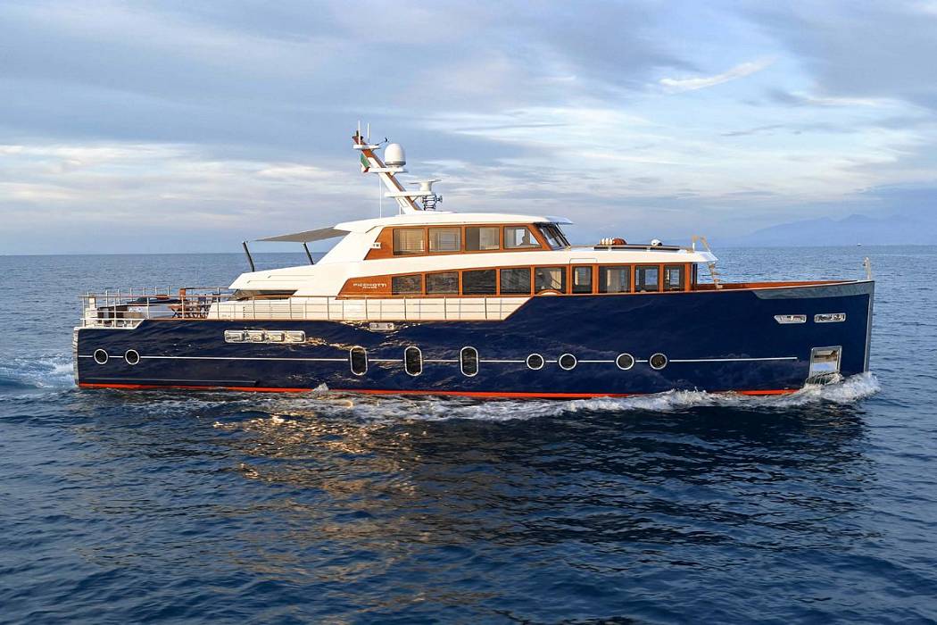 Picchiotti 24 is a brand-new opportunity on the market: a chance to acquire a new classic yacht without the wait. She is available for immediate delivery. The Picchiotti 24 measures 23.96 m overall with a 6.5 m beam and 150 GT.She is built in aluminium on a semi-displacement hull with an aluminium superstructure. Exterior and interior design is by Luca Dini and TISG Centro Stile. The Picchiotti 24 is powered by twin MAN engines rated at 1,300 hp each; she cruises at 16 knots and reaches 19 knots. Cruising at 9 knots, she has a 1,800-nautical-mile range.