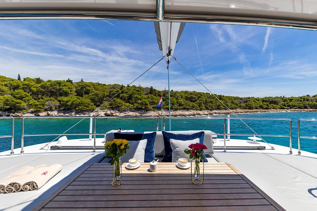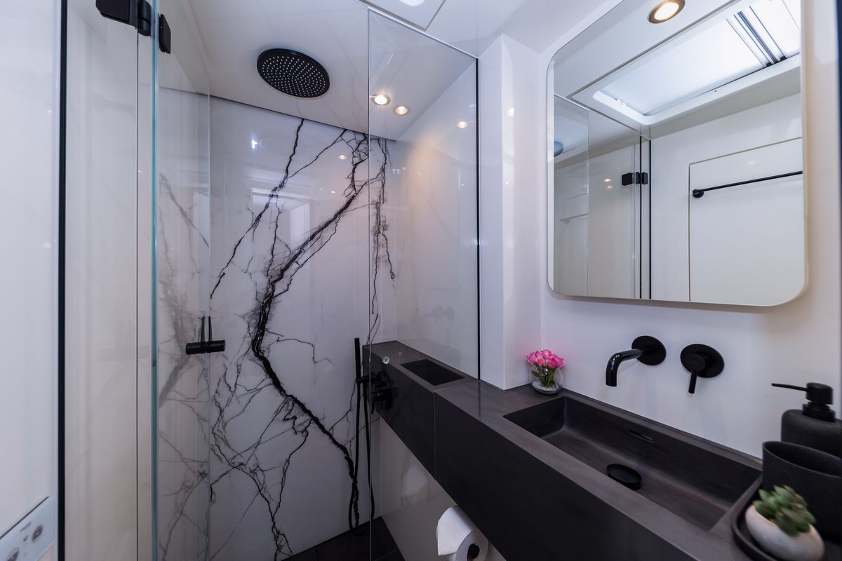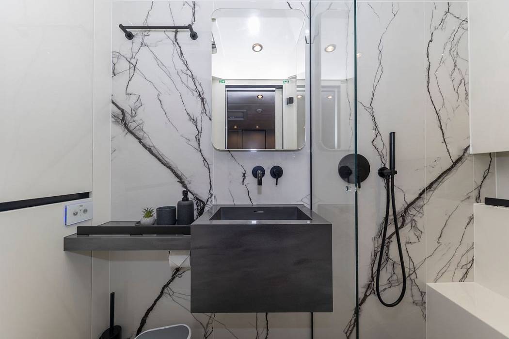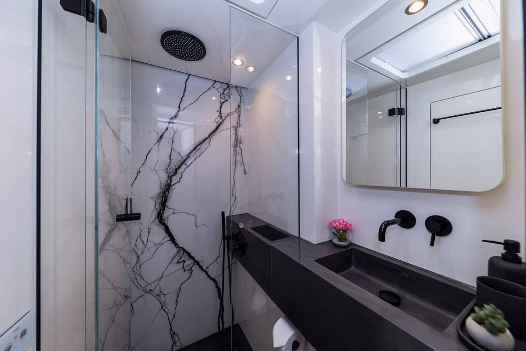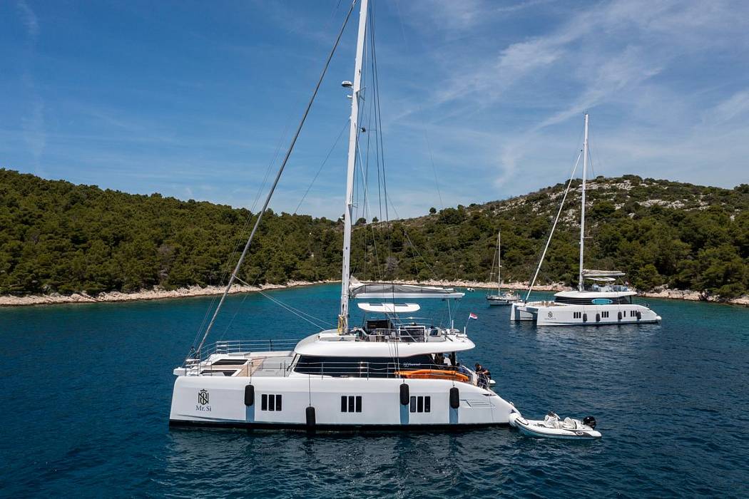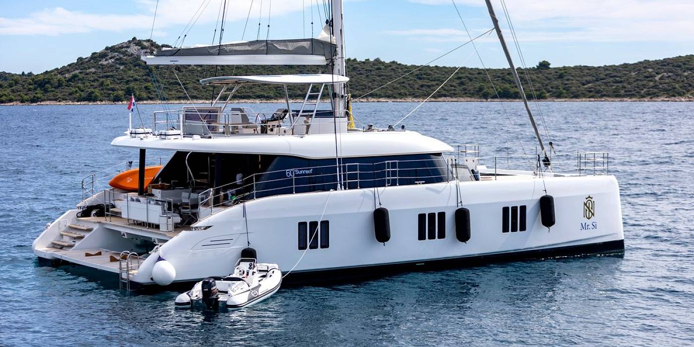 Delivered in December 2023, the Sunreef 60 Mr.Si is presented in near-new condition with continuous care from a dedicated three-person crew. The Sunreef 60 Mr.Si offers over 230 square metres of usable space, with a layout focused on volume, circulation, and separation between guest and crew areas. The Sunreef 60 Mr.Si uses a galley-down configuration, keeping the main deck fully available for social areas and reducing service traffic around guests.The Sunreef 60 Mr.Si accommodates four guest cabins, each fitted with en-suite bathrooms, independent air-conditioning systems, and individual controls. A separate crew cabin ensures operational privacy. Inside, the Sunreef 60 Mr.Si features a fully custom interior with dark finishes and gold-toned detailing, built from selected materials and tailored elements rather than standard production options.
