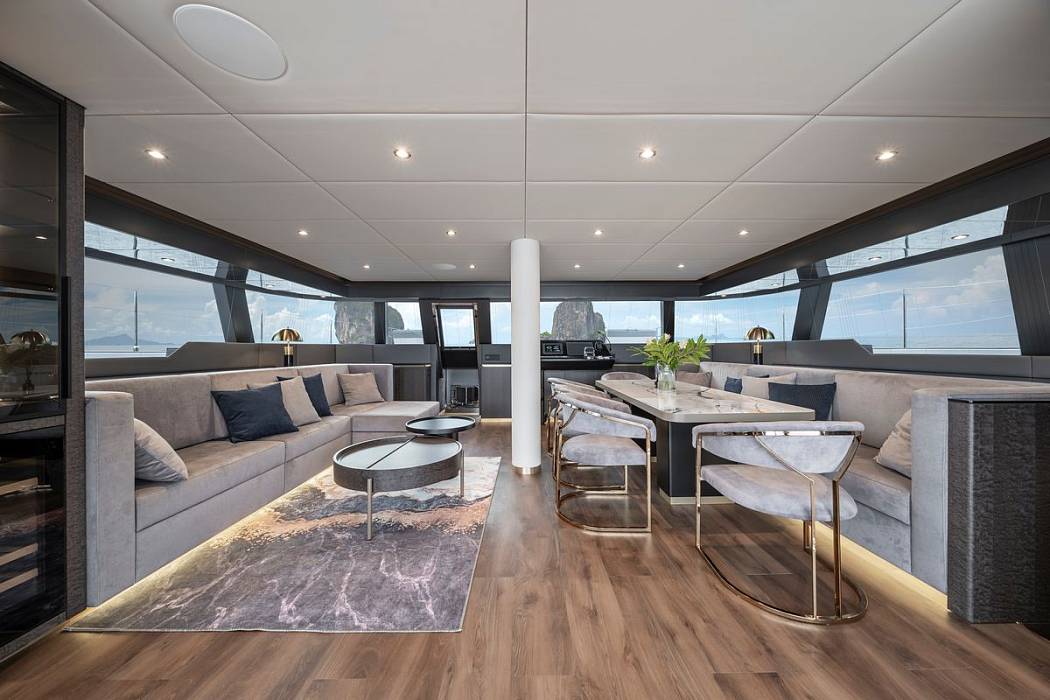 The main saloon on the Sunreef 60 Mr.Si is defined by large vertical glazing, bringing in consistent natural light and open sightlines. Sliding glass doors connect directly to the cockpit, creating a continuous indoor-outdoor flow.