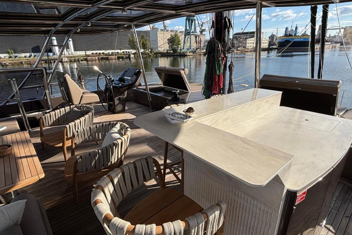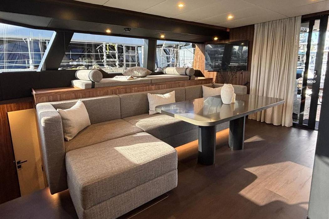 Inside the salon, the Sunreef 60 Sailing Sella Mare is finished in milled American walnut. Additional equipment includes upgraded navigation electronics for Croatia flag requirements, external power sockets, and a composite bimini mounted on stainless supports. The yacht is also delivered with an AG S450C ALU-RIB tender.
