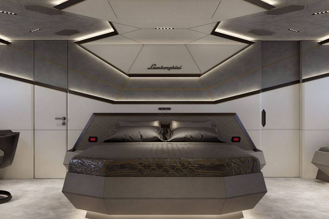 Inside, the Tecnomar for Lamborghini 101 combines technical sophistication with tailored comfort. The saloon features angular forms, bold lighting contrasts, and materials inspired by Lamborghini’s automotive interiors. Four guest cabins accommodate up to eight guests, each customizable in finish and layout. The triple helm seats mirror those in Lamborghini supercars, reinforcing the brand’s DNA throughout the Tecnomar for Lamborghini 101 yacht.