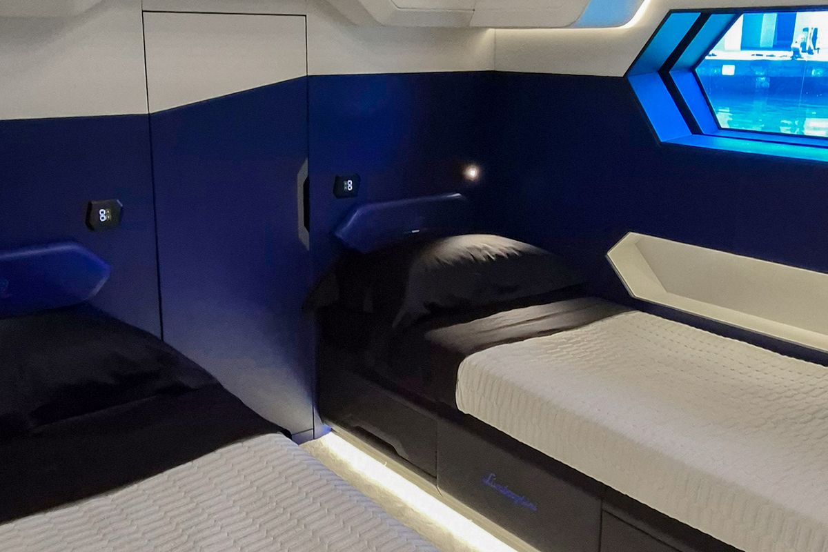 Accommodation is arranged in two independent cabins: a forward master with a king-size berth and a guest cabin that converts between twin singles and a large double. She suits a couple accompanied by family or friends and maximizes available volume with practical storage solutions. Overall, the Tecnomar for Lamborghini 63 aligns performance, design, and usability.
